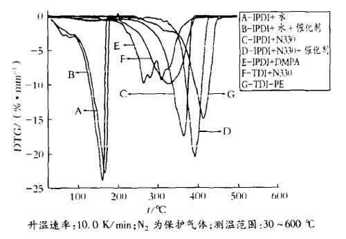 0引言 丙烯酸[BingXiSuan]改性[GaiXing]水性聚氨酯[JuAnZhi]的應(yīng)用不僅有明顯的環(huán)境效益,同時由于兼具丙烯酸[BingXiSuan]的耐候性與聚氨酯[JuAnZhi]的力學(xué)性能和耐化學(xué)品性能而倍受人們的關(guān)注。近年來,人們逐漸開始在領(lǐng)域使用丙烯酸[BingXiSuan]改性[GaiXing]水性聚氨酯[JuAnZhi]作為成膜樹脂,涉及領(lǐng)域包括塑料、防腐及汽車等。。然而在這些領(lǐng)域除要求成膜物需要具有良好的耐化學(xué)品性、耐水性及機械性能外,還要考慮其耐熱特征,這樣可以確保涂層在實際應(yīng)用過程中遇熱時不易降解。目前對丙烯酸[BingXiSuan]改性[GaiXing]水性聚氨酯[JuAnZhi]的耐熱穩(wěn)定性[WenDingXing]行為的研究很少見于報道。本文從多異氰酸酯與多元醇反應(yīng)[FanYing]后分子[FenZi]鏈的穩(wěn)定性[WenDingXing]出發(fā),利用TG/DTG的分析測試結(jié)果,設(shè)計熱穩(wěn)定性[WenDingXing]良好的丙烯酸[BingXiSuan]改性[GaiXing]水性聚氨酯[JuAnZhi]的分子[FenZi]結(jié)構(gòu),在此基礎(chǔ)上合成了綜合性能良好的丙烯酸[BingXiSuan]改性[GaiXing]聚氨酯[JuAnZhi]水乳液。 1實驗 1.1主要原料 二羥甲基[JiaJi]丙酸(DMPA),99.5%,山東東營賽美克化工廠;TDI混合體,工業(yè)級,日本三井株式會社;Ⅳ一甲基[JiaJi]吡咯烷酮(NMP),工業(yè)級;聚醚N330,工業(yè)級,南京金陵石化;甲基[JiaJi]丙烯酸[BingXiSuan]甲酯(MMA),工業(yè)級,北京東方化工廠;甲基[JiaJi]丙烯酸[BingXiSuan]羥乙酯(HEMA),工業(yè)級,上海珊瑚化工廠;偶氮二異丁腈,工業(yè)級,武進焦溪陳巷化工廠;三乙胺(TEA),化學(xué)純;二乙醇胺,化學(xué)純;聚酯二元醇(羥值49.6mgKOH/g),常州化工研究院;IPDI,工業(yè)品,HiilCo.提供。 1.2測試方法 TD—DTG.NETZSCHGeratebauGmbHThermalAnalysis;傅里葉變換紅外光譜儀,NicoletInstrumentCorp;掃描電子顯微鏡,JEDLJSM一5600LV日本電子株式會社。 1.3聚氨酯[JuAnZhi]預(yù)分散體的制備 將聚醚、DMPA、TDI、HEMA、部分NMP等投入帶攪拌器、導(dǎo)氣管與溫度計的四口燒瓶,啟動攪拌,通氮氣升溫至95ClC,并保溫2h,降溫加三乙胺中和,攪拌一段時間加水分散制得分散體。 1.4丙烯酸[BingXiSuan]改性[GaiXing]水性聚氨酯[JuAnZhi]分散體的制備 將上述分散體通氮氣并升溫至70ClC左右,緩慢加入甲基[JiaJi]丙烯酸[BingXiSuan]甲酯、偶氮二異丁腈,然后保溫一段時間,補加剩余的NMP及引發(fā)劑,升溫至85ClC并繼續(xù)保溫適宜時間,冷卻出料,待測。 2活性氫與異氰酸酯反應(yīng)[FanYing]聚合物分子[FenZi]鏈的斷裂穩(wěn)定性[WenDingXing] 將活性氫化合物(聚醚N一330、聚酯一PE、DMPA、HO)分別與含異氰酸酯的化合物(TDI、IPDI)按等物質(zhì)的量配制混勻,同時為了考察催化劑的影響,加入混合物總量0.0l%的二月硅酸二丁基錫?;旌衔镌?SPAN lang=EN-US>60ClC加熱24h直至完全反應(yīng)[FanYing]。然后分別用TG/DTG對反應(yīng)[FanYing]生成[ShengCheng]的聚合物進行測試,觀察各聚合物的起始分解溫度及分解過程中的狀態(tài),結(jié)果見圖1。 從圖1中可以看出:水與IPDI反應(yīng)[FanYing]生成[ShengCheng]產(chǎn)物的熱穩(wěn)定性[WenDingXing]很差,當(dāng)存在催化劑二月桂酸二丁基錫時,生成[ShengCheng]產(chǎn)物的熱穩(wěn)定性[WenDingXing]進一步下降。而對聚醚N一330而言,反應(yīng)[FanYing]過程中存在催化劑可以使生成[ShengCheng]物的熱穩(wěn)定性[WenDingXing]上升,說明催化劑對多元醇的作用與效果不同。在 圖1 多異氰酸酯-b多元醇單元反應(yīng)[FanYing]的DTG曲線