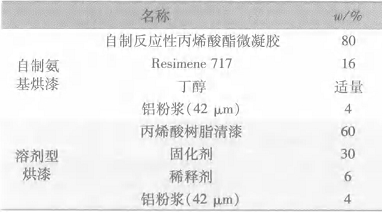 1.4水性丙烯酸[BingXiSuan]酯-氨基烘漆的配制 以反應[FanYing]性丙烯酸[BingXiSuan]微凝膠[NingJiao]和Resimene717配制水性氨基烘漆,同時配制市場上溶劑型丙烯酸[BingXiSuan]樹脂[ShuZhi]烘漆作為對比,對比配方見表2。 表2 水性氨基烘漆配方