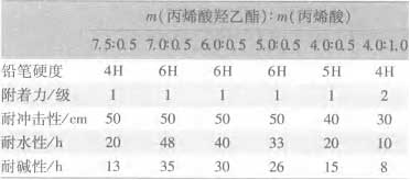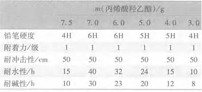 由表3可以看出,隨著丙烯酸[BingXiSuan]羥乙酯[YiZhi]用量[YongLiang]的增加,涂膜的性能[XingNen]也隨著提高,這是由于丙烯酸[BingXiSuan]羥乙酯[YiZhi]中帶有極性的羥基是活性基團,能夠與氨基樹脂[ShuZhi]反應[FanYing],從而提高微凝膠[NingJiao]的綜合性能[XingNen]。但是丙烯酸[BingXiSuan]羥乙酯[YiZhi]用量[YongLiang]太高時,微凝膠[NingJiao]乳液的黏度變大,宏觀大粒子凝膠[NingJiao]增多,工藝變得難以控制。所以丙烯酸[BingXiSuan]羥乙酯[YiZhi]用量[YongLiang]為7.0g時,微凝膠[NingJiao]的制備工藝及性能[XingNen]最好。羥基丙烯酸[BingXiSuan]樹脂[ShuZhi]的羥值主要由丙烯酸[BingXiSuan]羥乙酯[YiZhi]的用量[YongLiang]決定,當丙烯酸[BingXiSuan]羥乙酯[YiZhi]的用量[YongLiang]為7g時,丙烯酸[BingXiSuan]酯微凝膠[NingJiao]的羥值為58mgKOH/g,得到的微凝膠[NingJiao]性能[XingNen]較理想。 2.2丙烯酸[BingXiSuan]羥乙酯[YiZhi]和丙烯酸[BingXiSuan]用量[YongLiang]對涂膜性能[XingNen]的影響[YingXiang] 丙烯酸[BingXiSuan]羥乙酯[YiZhi]和丙烯酸[BingXiSuan]用量[YongLiang]對涂膜性能[XingNen]的影響[YingXiang]見表4。 其中烘漆的組成為:m(微凝膠[NingJiao])∶m(Resimene717)∶m(鋁粉漿)=80∶16∶4。 表 4 丙烯酸[BingXiSuan]羥乙酯[YiZhi]和丙烯酸[BingXiSuan]用量[YongLiang]對涂膜性能[XingNen]的影響[YingXiang]