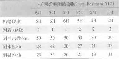 1.5配制工藝 在燒杯中,按表2加入各種物料,攪拌均勻后,用錐型磨磨至細度<20μm,用100目篩網過濾,分別得到水性丙烯酸[BingXiSuan]氨基烘漆和溶劑型烘漆。 1.6烘烤條件 將涂片放在烘箱中在140℃,烘烤30min。 1.7性能[XingNen]測試 涂膜的硬度、附著力、耐沖擊性分別采用國標(GB/T6739—1996、GB/T1720—1979、GB/T1732—1993)方法測定。涂膜的耐水性和耐堿性測試方法:分別將鋁片涂膜浸入水中和10%NaOH溶液中,觀察涂膜的起泡及剝落情況。 2結果與討論 2.1丙烯酸[BingXiSuan]羥乙酯[YiZhi]用量[YongLiang]對涂膜性能[XingNen]的影響[YingXiang] 丙烯酸[BingXiSuan]羥乙酯[YiZhi]用量[YongLiang]對涂膜性能[XingNen]的影響[YingXiang]見表3,丙烯酸[BingXiSuan]用量[YongLiang]為0。自制烘漆配方為:m(微凝膠[NingJiao])∶m(Resimene717)∶m(鋁粉漿)=80∶16∶4。 表 3 丙烯酸[BingXiSuan]羥乙酯[YiZhi]用量[YongLiang]對涂膜性能[XingNen]的影響[YingXiang]