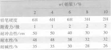 由表5可知,氨基樹脂[ShuZhi]與自制反應[FanYing]性丙烯酸[BingXiSuan]酯微凝膠[NingJiao]的配比為1∶5時所制得的涂膜具有良好的綜合性能[XingNen]。這是由于三聚氰胺甲醛樹脂[ShuZhi]自身可以發生自縮聚反應[FanYing]。若自縮聚反應[FanYing]多,則生成許多二聚體、三聚體以及其他多聚體,形成的漆膜耐久性差、硬而脆、耐沖擊性差。故配漆時在滿足氨基樹脂[ShuZhi]與丙烯酸[BingXiSuan]樹脂[ShuZhi]充分反應[FanYing]的條件下盡可能降低氨基樹脂[ShuZhi]用量[YongLiang],以阻止自縮聚反應[FanYing],形成希望的立體交聯結構。 2.4鋁粉漿用量[YongLiang]對涂膜性能[XingNen]的影響[YingXiang] 表6為鋁粉漿用量[YongLiang]對涂膜性能[XingNen]的影響[YingXiang]。 表 6 鋁粉漿用量[YongLiang]對涂膜性能[XingNen]的影響[YingXiang]