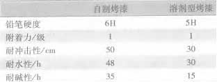 由表6可知,本次實驗鋁粉漿用量[YongLiang]控制在漆料總質量的4%時涂膜性能[XingNen]最好,這時由于鋁粉漿用量[YongLiang]<4%,烘漆金屬效果不佳。如果鋁粉漿用量[YongLiang]>4%,會導致鋁粉外露,嚴重影響[YingXiang]涂膜的豐滿度和光澤。 2.5自制烤漆與溶劑型烤漆比較 表7為自制烤漆與溶劑型烤漆的性能[XingNen]比較。 表 7 自制烤漆與溶劑型烤漆的性能[XingNen]比較