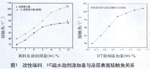 由圖 1 可知, 單獨添加[TianJia]改性[GaiXing]填料、 H T 疏水[ShuShui]助劑對涂層[TuCeng]的接觸[JieChu]角均有提高, 而以 H T 疏水[ShuShui]助劑提高顯著。隨著改性[GaiXing]填料添加[TianJia]量的增加, 接觸[JieChu]角由 75 ° 增加至 92 °, 過量添加[TianJia]其接觸[JieChu]角的增量不大, 以 10% 添加[TianJia]量為好; H T 疏水[ShuShui]助劑以 1% 的添加[TianJia]量為好。將二者混合添加[TianJia]時 (1%H T 助劑 + 改性[GaiXing]滑石粉 ),其疏水[ShuShui]效果更加明顯, 總添加[TianJia]量大于 11% 時, 接觸[JieChu]角可達 105 °,涂層[TuCeng]表面[BiaoMian]具有良好的疏水[ShuShui]性。 2.3 改性[GaiXing]氣相 SiO2 對涂層[TuCeng]表面[BiaoMian]粗糙[CuCao]度、接觸[JieChu]角的影響 荷葉表面[BiaoMian]微觀結構研究發現 , 荷葉表面[BiaoMian]乳突 ( 平均直徑 5 ~ 9 μ m) 上還存在納米結構 [(124.3 ± 3.2) n m], 這種微米結構與納米結構相結合的階層結構是產生超疏水[ShuShui]和自清潔[QingJie]效應的根本原因 , 合適的表面[BiaoMian]粗糙[CuCao]度對于構建疏水[ShuShui]性自清潔[QingJie]表面[BiaoMian]非常重要。本文在上述試驗的基礎上, 進行了添加[TianJia]無定型 SiO2 以改善涂層[TuCeng]表面[BiaoMian]的粗糙[CuCao]度 , 以便進一步改善涂層[TuCeng]表面[BiaoMian]的疏水[ShuShui]性。 圖 2 偶聯劑改性[GaiXing]無定型 SiO2 添加[TianJia]量對涂層[TuCeng]表面[BiaoMian]粗糙[CuCao]度、接觸[JieChu]角性關系