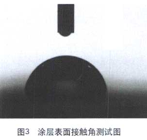 圖 2 為偶聯劑改性[GaiXing]無定型 SiO2 添加[TianJia]量對涂層[TuCeng]表面[BiaoMian]粗糙[CuCao]度、疏水[ShuShui]性關系曲線。其中粗糙[CuCao]度為相對于涂層[TuCeng]表面[BiaoMian] 1 μ m 高度的比值。由圖 2 可知 , 隨 SiO2 的添加[TianJia] , 涂層[TuCeng]表面[BiaoMian]粗糙[CuCao]度有所改善 , 同時涂層[TuCeng]表面[BiaoMian]的疏水[ShuShui]性進一步提高 , 當添加[TianJia]量大于 0.25% 時 , 涂層[TuCeng]表面[BiaoMian]的接觸[JieChu]角可達 109 ° 。其表面[BiaoMian]接觸[JieChu]角測試如圖 3 所示。 We n ze 曾就液體相對于固體表面[BiaoMian]的接觸[JieChu]角與表面[BiaoMian]的粗糙[CuCao]度作過定性描述, 即粗糙[CuCao]度定義為固體與液體接觸[JieChu]面之間的真實面積與幾何面積的比值。γ =cos θ γ /cos θ ( γ≥ 1 ;θ≠ 90 ° ) 其中:θ γ 為液體在粗糙[CuCao]表面[BiaoMian]上的接觸[JieChu]角 ; θ為液體在理想光滑面上的真實接觸[JieChu]角。