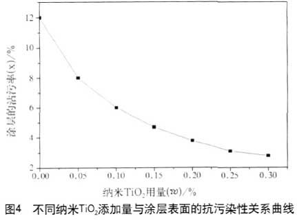 由此可知 , θ > 9 0 ° 時 , 粗糙[CuCao]度可使接觸[JieChu]角θ進一步增大 , 即粗糙[CuCao]度可提高表面[BiaoMian]的疏水[ShuShui]性;θ <90 ° 時 , 粗糙[CuCao]度可使θ進一步變小 , 即可使表面[BiaoMian]疏水[ShuShui]性降低。表面[BiaoMian]粗糙[CuCao]度可使表面[BiaoMian]疏水[ShuShui]性強者更強 , 弱者更弱。因此合理的設計涂層[TuCeng]表面[BiaoMian]的粗糙[CuCao]度非常關鍵 , 本試驗中涂層[TuCeng]表面[BiaoMian]的接觸[JieChu]角均已大于 90 ° , 在不影響表面[BiaoMian]光澤及平整度的條件下 , 微米級的粗糙[CuCao]表面[BiaoMian]有利于改善涂層[TuCeng]表面[BiaoMian]的疏水[ShuShui]性。 2.4 銳鈦型納米 TiO 2 對抗污性能的影響 在上述研究的基礎上 , 嘗試了在光催化作用下, 涂層[TuCeng]表面[BiaoMian]污染物可沖洗性的性能研究。圖 4 為在中添加[TianJia]具有光催化作用的銳鈦型納米 TiO2 對涂層[TuCeng]抗污染性能關系曲線。其中涂層[TuCeng]表面[BiaoMian]的抗污染性測試標準及過程參照 GB/T9780 進行。