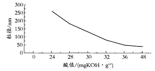 0 引 言 中厚膜陰極電泳漆作為汽車用底漆時(shí)具備一定的防腐性能[XingNen] , 但隨著汽車工業(yè)的迅速發(fā)展 , 底盤等汽車黑色件在原有鹽霧性能[XingNen]要求上 , 進(jìn)一步要求將老化性能[XingNen]提高 , 從而使電泳一道陰極電泳漆既具備底漆性能[XingNen] , 又達(dá)到面漆耐老化性能[XingNen] , 進(jìn)而滿足涂裝優(yōu)化工藝、節(jié)約成本的需求。本文在研究環(huán)氧體系的基礎(chǔ)上 , 通過冷拼丙烯酸[BingXiSuan]樹脂[ShuZhi]的改性作用 [ 1 ] , 針對乳液[RuYe]在施工應(yīng)用中的穩(wěn)定性 , 探討了親水性溶劑、酸值對乳液[RuYe]及漆膜的影響[YingXiang] , 并用液相色譜儀對丙烯酸[BingXiSuan]環(huán)氧比例[BiLi]進(jìn)行分析 , 最后用人工加速老化實(shí)驗(yàn)加以驗(yàn)證 , 達(dá)到了底面合一品種的要求 [ 1 ] 。 1 實(shí)驗(yàn)部分 1 .1 主要原料 環(huán)氧樹脂[ShuZhi] E - 20: 工業(yè)品 ; 異丁醇 : 化學(xué)純 ; 乙二醇丁醚 : 化學(xué)純 ; 十二烷基苯酚 : 化學(xué)純 ; 二甲基芐胺 : 化學(xué)純 ; 丙二醇苯醚 : 化學(xué)純 ; 交聯(lián)劑 : 自制 ; 陽離子型丙烯酸[BingXiSuan]樹脂[ShuZhi] : 自制 ; 去離子水 : 自制 ; 冰醋酸 : 工業(yè)品 ; 乳酸 : 工業(yè)品 ; 羥甲基乙醇胺 : 化學(xué)純 ; N, N - 二甲基丙胺 : 化學(xué)純 ; 二氧化鈦 : 工業(yè)品 ; 炭黑 : 工業(yè)品 ; 硅酸鋁 : 工業(yè)品。 1 .2 合成工藝 將一定量的環(huán)氧樹脂[ShuZhi]、十二烷基苯酚、二甲苯、二甲基芐胺依次加入到 250 mL 四口燒瓶中 , 通入 N 2 氣加熱至 100 ~ 120 ℃ 保溫 30 min, 然后升溫至 140 ℃ 保溫并檢測環(huán)氧當(dāng)量值 , 達(dá)到 1 000 ~ 1 100 g / eq 后降溫 , 至 90 ℃ 時(shí)加入乙二醇單丁醚、二甲苯、異丁醇、羥甲基乙醇胺 , 攪拌 30 min 后加入陽離子型丙烯酸[BingXiSuan]樹脂[ShuZhi]和交聯(lián)劑 , 充分?jǐn)嚢?SPAN lang=EN-US> 2 h 后 , 在 70 ℃ 保溫制成樹脂[ShuZhi]混合物備用。 將去離子水、冰醋酸、乳酸依次加入 1 000 mL 四口燒瓶中均勻混合 , 取樣測酸價(jià)為 (30 ± 2) mgKOH /g, 開動(dòng)高速攪拌將制好的樹脂[ShuZhi]混合物加入 , 50 ℃ 左右攪拌 30 min, 開啟真空泵 , 使瓶中真空度達(dá)到 0 . 1MPa 左右 , 抽提混合物中溶劑 , 當(dāng)抽出物達(dá)到總量 30% 時(shí)停止 , 補(bǔ)加等量去離子水后攪拌均勻。 將一定量丙烯酸[BingXiSuan]樹脂[ShuZhi]、乳酸、去離子水、二氧化鈦、炭黑、硅酸鋁高速預(yù)混均勻 , 在砂磨機(jī)中研磨約 0 .5 h, 細(xì)度小于 15 μ m 即可。 將乳液[RuYe]、灰漿、去離子水按 6 ∶ 1 ∶ 6 比例[BiLi]混合均勻 , 熟化 24 h 后泳板測試。 1 .3 測試方法 用 721E 型可見分光光度計(jì)測定乳液[RuYe]粒徑 ; 用氣相色譜儀測定槽液溶劑含量[HanLiang] ; 用 Agilent 1100 液相色譜儀分析槽液丙烯酸[BingXiSuan]、環(huán)氧樹脂[ShuZhi]比例[BiLi] ; 用 DDS - 307 電導(dǎo)率儀測槽液電導(dǎo)率 ; 用 PHS - 3C 測定槽液 pH 值 ; 用 QUV 人工老化機(jī)測漆膜加速老化性能[XingNen]指標(biāo) ; 用中性鹽霧機(jī)測漆膜耐鹽霧性能[XingNen] ; 槽液及漆膜其他指標(biāo)分別按相應(yīng)國標(biāo)測試。 2 結(jié)果與討論 2 .1 乳液[RuYe]粒徑與酸值的關(guān)系 在電泳過程中 , 乳液[RuYe]粒徑對漆膜外觀有著重要影響[YingXiang] , 粒徑過小時(shí)對漆膜厚度增加不利 ; 而粒徑過大時(shí) , 則對漆膜致密性及外觀平整性不利 , 通常選取 40 ~ 150 nm 較為合適 , 通過實(shí)驗(yàn)發(fā)現(xiàn) , 酸值在乳化過程與乳液[RuYe]粒徑存在一定關(guān)系 [ 3 ] , 如圖 1 。