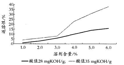 從圖 1 可知 : 在樹脂[ShuZhi]固體分一定時(shí) , 乳液[RuYe]的粒徑開始隨酸值的增加而迅速降低 , 當(dāng)酸值達(dá)到 40 mgKOH /g 后 , 粒徑隨酸值變化較小 , 按電泳產(chǎn)品的工藝要求 , 選取酸水酸值在 28 ~ 35mgKOH /g 之間。 2 .2 溶劑含量[HanLiang]對漆膜返溶性的影響[YingXiang] 漆膜的返溶由樹脂[ShuZhi]本身的親水性所決定 , 影響[YingXiang]樹脂[ShuZhi]的水溶性因素很多 , 樹脂[ShuZhi]本身的 NH +4 含量[HanLiang]和合成工藝的變化都將對電泳漆膜的水溶性產(chǎn)生不同程度的影響[YingXiang]。在此情況下 , 我們研究了樹脂[ShuZhi]的溶劑含量[HanLiang]對漆膜返溶性的影響[YingXiang] , ( 在不同酸值條件下 ) 結(jié)果見圖 2 。