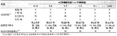 圖 2 不同溶劑含量[HanLiang]對漆膜返溶性的影響[YingXiang] 從圖 2 中 , 可以分析得出 , 溶劑含量[HanLiang]低于 3% 時(shí) , 漆膜返溶比例[BiLi]低于 10% , 符合電泳漆要求 , 由于過低溶劑含量[HanLiang]使漆膜平整性較差 , 我們選取溶劑在 2% ~ 3% 之間。 2 .3 丙烯酸[BingXiSuan]樹脂[ShuZhi]用量對漆膜邊緣覆蓋性及老化鹽霧性能[XingNen]的影響[YingXiang] 環(huán)氧樹脂[ShuZhi]賦予漆膜較好的鹽霧性能[XingNen]和邊緣覆蓋性能[XingNen] , 丙烯酸[BingXiSuan]樹脂[ShuZhi]通常在老化性能[XingNen]上優(yōu)于環(huán)氧樹脂[ShuZhi] , 但用量較大時(shí)將對其鹽霧性和邊緣覆蓋率造成影響[YingXiang] , 所以必須平衡丙烯酸[BingXiSuan]樹脂[ShuZhi]與環(huán)氧樹脂[ShuZhi]的比例[BiLi] , 使漆膜既有良好的耐候性 , 又有較好的銳邊耐蝕性及 QUV 老化、鹽霧性能[XingNen] , 實(shí)驗(yàn)結(jié)果見表 1 。 表 1 丙烯酸[BingXiSuan]樹脂[ShuZhi]與環(huán)氧樹脂[ShuZhi]的質(zhì)量比對漆膜性能[XingNen]的影響[YingXiang]