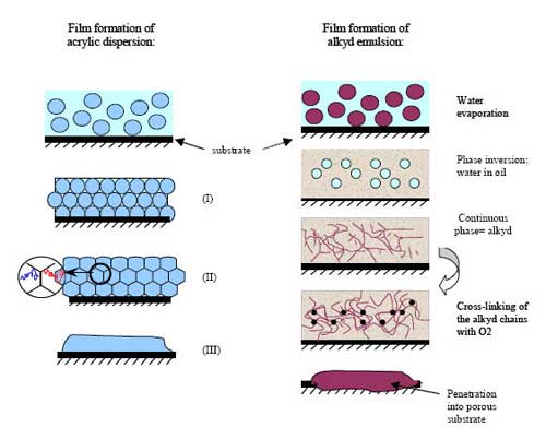 圖3:光學顯微鏡下觀察到的標準醇酸樹脂[ShuZhi]乳液[RuYe]和丙烯酸[BingXiSuan]分散[FenSan]體在木材中的滲透現象 自交聯水性粘結[ZhanJie]劑: 與(苯乙烯)-丙烯酸[BingXiSuan]樹脂[ShuZhi]分散[FenSan]體系不同,醇酸樹脂[ShuZhi]乳液[RuYe]是一種真正可以[KeYi]實現自交聯的水性材料。在醇酸樹脂[ShuZhi]鏈的氧化作用(室溫固化)和催化劑對整個過程的加速作用下,醇酸樹脂[ShuZhi]乳液[RuYe]可以[KeYi]形成一個交聯的3D網絡。該性質是由醇酸樹脂[ShuZhi]本身的化學性質所決定的。然而在丙烯酸[BingXiSuan]樹脂[ShuZhi]分散[FenSan]體系中,需要借助功能性單體才能形成交聯網絡。因此,由醇酸樹脂[ShuZhi]乳液[RuYe]所制成的有可能應用在低溫、無結合劑的情況下;并且由于交聯體系的存在,使得材料具有[JuYou]一定的硬度和耐化學腐蝕以及耐污性。 更進一步而言,由于醇酸樹脂[ShuZhi]乳液[RuYe]所成的膜更為均一,因而透水性得到了提高。經過干燥后所建立的交聯網絡對水的滲透阻礙作用增強。然而需要注意的是,不論醇酸樹脂[ShuZhi]乳液[RuYe]的化學結構如何,都必須在親水性基團存在的條件下,醇酸樹脂[ShuZhi]才能發生乳化并生成穩定的體系。不論是內在的還是外在的(例如表面活性劑)親水性基團,都不會具有[JuYou]和標準溶劑型醇酸樹脂[ShuZhi]相同水平的疏水性。但是測試結果表明:與標準的丙烯酸[BingXiSuan]樹脂[ShuZhi]分散[FenSan]體相比,醇酸樹脂[ShuZhi]乳液[RuYe]的液體及水蒸汽透過性與溶劑型樹脂[ShuZhi]更接近。而與丙烯酸[BingXiSuan]分散[FenSan]體相比,醇酸樹脂[ShuZhi]乳液[RuYe]一個更大的優點是改善了體系的耐鹽霧性能。 應用性能: 專業的油漆工,尤其是法國的專業油漆工,已經不愿意使用含丙烯酸[BingXiSuan]分散[FenSan]體的,尤其是不會將含丙烯酸[BingXiSuan]的用作墻壁。原因在于含丙烯酸[BingXiSuan]的的應用性能差。溶劑型醇酸樹脂[ShuZhi]體系由于可以[KeYi]滿足牛頓流體的分布,因而具有[JuYou]很好的應用性。此外,溶劑型醇酸樹脂[ShuZhi]體系只有在溶劑揮發的情況下體系的粘度才會逐漸增加;并且聚合物在這個過程中始終保持可溶性。當油漆工使用另一種以糾正先前使用所造成的表面缺陷時,溶劑與第一種之間仍然存在密切的關系:第一種會對醇酸樹脂[ShuZhi]鏈進行[JinXing]溶解,并且使得兩種具有[JuYou]良好的均勻性。兩者的關系可以[KeYi]生成具有[JuYou]良好的水平性和超長露天時間的漆膜。 水性分散[FenSan]體系具有[JuYou]剪切變稀的流體行為。的低切黏度通常是比較高并且難以調節的,從而導致了的流動性和流平性差,進而難以進行[JinXing]涂刷應用,并且會在干燥之后留下涂刷的痕跡。這是由于在水份蒸發的過程中,當臨界體積分數和最大聚集率接近時,黏度就會劇烈增加。當達到這個比例時,聚合物顆粒會發生不可逆的團聚現象。若要對表面進行[JinXing]再處理,則會在產品表面留下更多的涂刷痕跡。與標準的高分子量丙烯酸[BingXiSuan]樹脂[ShuZhi]分散[FenSan]體相比,醇酸樹脂[ShuZhi]乳液[RuYe]由于具有[JuYou]相對較低的分子量以及相反轉成膜機制(而非結合步驟),促使了具有[JuYou]改進應用特征的的產生。產品的露天時間盡管無法達到和溶劑型一樣的水平,但是仍然得到了改善。然而它們很好的應用性能,尤其是更好的流動性和流平性得到了油漆工們的高度評價。更為均一的漆膜將會具有[JuYou]更高的光澤度、更出眾的亮度以及鏡面表面。 化學改性: 除了這些優點之外,對醇酸樹脂[ShuZhi]的骨架進行[JinXing]化學改性可以[KeYi]促使產生具有[JuYou]更好性能的新的聚合物分子。我們可以[KeYi]設想使用丙烯酸[BingXiSuan]、異氰酸酯、硅樹脂[ShuZhi]對其進行[JinXing]改性。 特別地,聚氨酯改性可以[KeYi]改善的干燥性能、硬度、耐磨損、耐刮擦性以及耐水和耐化學腐蝕/耐污性。 通過聚氨酯改性的粘結[ZhanJie]劑在包括建筑和工業領域在內的很多領域中都有所應用。例如,可以[KeYi]用在高質量的、清漆、地板、防銹底漆、高光面漆以及直接用于金屬領域中。室外應用要求粘結[ZhanJie]劑中含有IPDI(因為TDI會使的室外耐久力較差)。 使用丙烯酸[BingXiSuan]進行[JinXing]改性可以[KeYi]在提高的耐久力的同時,保持醇酸樹脂[ShuZhi]在滲透性方面的優點,從而可以[KeYi]選擇其作為木器尤其是木材著色。 醇酸樹脂[ShuZhi]乳液[RuYe]與其它水性原料的共混 廣泛用于水性的丙烯酸[BingXiSuan]樹脂[ShuZhi]具有[JuYou]優于醇酸樹脂[ShuZhi]乳液[RuYe]的優點,尤其表現在具有[JuYou]低的泛黃性、良好的耐候性、快速的物理干燥性以及良好的光澤度保持性。 另一方面,光澤度、滲透性、粘結[ZhanJie]性、硬度以及交聯性這些性能并不是丙烯酸[BingXiSuan]樹脂[ShuZhi]本身所具有[JuYou]的。市場要求丙烯酸[BingXiSuan]樹脂[ShuZhi]在不犧牲薄膜性能的前提下具有[JuYou]低的MFT值。這一要求仍然是市場對樹脂[ShuZhi]生產商的一項挑戰。為了獲得良好的低溫成膜性能,良好的耐粘結[ZhanJie]性和硬度,并保持其良好的彈性,生產商們需要研發一種具有[JuYou]特定顆粒結構的聚合物,但是生產商們并不容易使產品達到這一要求。 因此,我們為什么不將醇酸樹脂[ShuZhi]乳液[RuYe]技術與丙烯酸[BingXiSuan]分散[FenSan]技術結合起來以獲得二者的最佳性能?