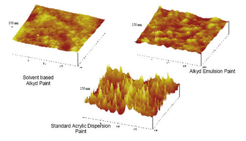 圖 1: 丙烯酸[BingXiSuan]樹脂[ShuZhi]分散[FenSan]體和醇酸樹脂[ShuZhi]乳液[RuYe]的成膜示意圖 高光澤度可能性 這種改進的成膜配方所產生的直接結果是有可能形成具有[JuYou]高光度的配方。具有[JuYou]特色的是,醇酸樹脂[ShuZhi]乳液[RuYe]可以[KeYi]在20°的條件下獲得85GU甚至更高的光澤度值;然而對于丙烯酸[BingXiSuan]樹脂[ShuZhi]分散[FenSan]體,在20°的條件下僅僅可以[KeYi]獲得50到65的光澤度值。即使近年來丙烯酸[BingXiSuan]樹脂[ShuZhi]分散[FenSan]體的新的研究進展已經促使這種類型的粘結[ZhanJie]劑有所改進,但是采用這種類型成膜機制所形成的膜始終無法獲得和采用醇酸樹脂[ShuZhi]技術所成膜相同的光澤度水平。 由于漆膜的光澤度水平與表面的粗糙度有關,因此原子力顯微鏡(AtomicForceMicroscopy,AFM)是一種方便的表征漆膜的工具。正如圖2所示,與使用傳統溶劑型(solvent-based,SB)醇酸樹脂[ShuZhi]相比,醇酸樹脂[ShuZhi]乳液[RuYe]可以[KeYi]形成高質量的薄膜,薄膜具有[JuYou]低的表面粗糙度和高光澤度可能性。