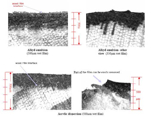 圖2:SB長油醇酸樹脂[ShuZhi]、醇酸樹脂[ShuZhi]乳液[RuYe]配方以及丙烯酸[BingXiSuan]樹脂[ShuZhi]配方的AFM圖樣比較 盡管上述物質實際上都是乳液[RuYe],但是最終而言,與丙烯酸[BingXiSuan]分散[FenSan]體相比,醇酸樹脂[ShuZhi]乳液[RuYe]所成的膜與溶劑型醇酸樹脂[ShuZhi]所成的膜更接近。因此,醇酸樹脂[ShuZhi]乳液[RuYe]所成膜與溶劑型醇酸樹脂[ShuZhi]所成膜的特點和性能相近。當然,光澤度是最明顯的特征之一;但是也具有[JuYou]醇酸樹脂[ShuZhi]技術的其它優點:滲透性、粘結[ZhanJie]性和耐化學腐蝕性。 對多孔基體的滲透 醇酸樹脂[ShuZhi]乳液[RuYe]的其它性質和溶劑型醇酸樹脂[ShuZhi]的對應性質類似,但是由于它的分子量相對較低,因而對多孔性基體具有[JuYou]很好的滲透作用。這些多孔性基體包括:木材、石膏等。我們可以[KeYi]依據醇酸樹脂[ShuZhi]乳液[RuYe]的滲透性,選擇其作為木材浸注、木材變色或底漆的粘結[ZhanJie]劑。保證滲透性的關鍵參數為:含有氯、顆粒尺寸、分子量以及應用的黏度。 一個簡單的例子說明了粘結[ZhanJie]劑對木材等基體的滲透能力。在云杉木板上使用一種標準的醇酸樹脂[ShuZhi]乳液[RuYe],并與標準的丙烯酸[BingXiSuan]分散[FenSan]體在光學顯微鏡下進行[JinXing]比較。如圖3所示,丙烯酸[BingXiSuan]粘結[ZhanJie]劑在木材表面保持完整性,因而容易成膜并且使用手指甲就可以[KeYi]從表面刮下;而醇酸樹脂[ShuZhi]乳液[RuYe]可以[KeYi]深入滲透到木材當中。