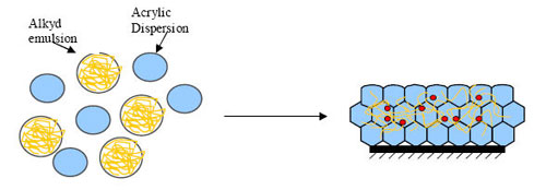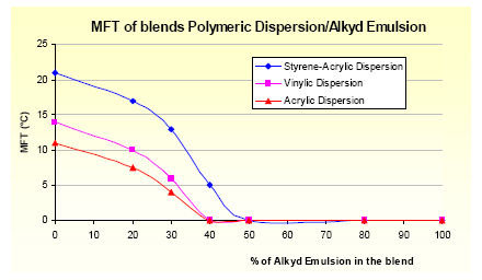 圖4:丙烯酸[BingXiSuan]分散[FenSan]體與醇酸樹脂[ShuZhi]乳液[RuYe]的共混 通過對醇酸樹脂[ShuZhi]乳液[RuYe]和丙烯酸[BingXiSuan]分散[FenSan]體進行[JinXing]仔細選擇,是有可能發現二者的相容體系的。正如圖5所示,醇酸樹脂[ShuZhi]乳液[RuYe]甚至可以[KeYi]作為丙烯酸[BingXiSuan]分散[FenSan]體的真正的結合劑,降低MFT值,從而允許傳統的高玻璃化轉變溫度丙烯酸[BingXiSuan]分散[FenSan]體的使用。