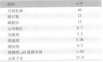 1 .2 實驗方法 第一步核聚合物乳液[RuYe]的合成 : 向裝有溫度計、攪拌裝置、回流冷卻器及滴液漏斗的四口瓶中加入復合乳化劑[RuHuaJi]、去離子水、 pH 值緩沖劑 , 攪拌融解均勻后 , 加入 50% 混合單體[DanTi] (BA 、 St 、 GMA) 作為核層單體[DanTi] , 攪拌通氮 30 min 后升溫至 60 ℃ , 一次性加入 1 /2 的引發劑 , 溫度上升 , 待體系溫度回落至 60 ℃ , 得到核聚合物乳液[RuYe]。 第二步核殼聚合物乳液[RuYe]的合成 : 在核聚合物乳液[RuYe]基礎上 , 開始滴加混合均勻的剩余單體[DanTi] (BA 、 St 、 MAA 、 PAM - 200) 、引發劑、乳化劑[RuHuaJi] , 1 h 滴完 , 繼續保溫 2.5 h, 得到核殼聚合物乳液[RuYe]。 降溫到 35 ℃ 以下 , 調節 pH 值為 7 ~ 8, 用 100 目的鋼絲網過濾 , 出料。 在高速分散缸中加入去離子水 , 依次加入分散劑 (BYK192) 、緩蝕劑 (15% 亞硝酸鈉溶液 ) 、顏填料 ( 磷酸[LinSuan]鋅、滑石粉、云母鐵紅 ) , 分散攪拌均勻后用錐形磨研磨 , 直至細度達到 30 μ m 以下 , 制得漿料。然后在低速攪拌下將乳液[RuYe]加入漿料中 , 加入成膜助劑、增稠劑、 pH 值調節劑、消泡劑 (BYK19) 混合攪拌均勻 , 過濾出料。 水性配方如表 2 所示。