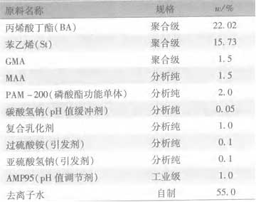 0 引 言 水性化是保護環境和節約石油資源的共同要求 [ 1 ] 。在金屬材料的中度防腐領域 , 防腐的水性化有非常大的發展空間。由于丙烯酸聚合物具有耐熱性、耐候性、耐腐蝕性、耐沾污性、保光保色性、附著力高和價格低等優點 , 輔以硬單體[DanTi]苯乙烯合成的苯丙乳液[RuYe] , 常被用作水性防銹成膜體系 , 但苯丙乳液[RuYe]涂膜致密性差 , 涂膜對水蒸氣屏蔽性能較差。使乳液[RuYe]交聯[JiaoLian]可以很好地解決丙烯酸酯涂膜致密性差的問題 [ 2 ] ; 同時在乳液[RuYe]共聚合時引入磷酸[LinSuan]酯功能單體[DanTi] , 利用磷酸[LinSuan]基團與金屬表面的相互作用 , 增強涂膜與金屬的附著力、提高[TiGao]抗閃蝕性能 , 同時增加乳液[RuYe]的鈣離子穩定性[WenDingXing] [ 3 ] 。 本文以苯乙烯和丙烯酸丁酯為共聚單位 , 以甲基丙烯酸縮水甘油酯 ( GMA) / 甲基丙烯酸甲酯 (MAA) 為交聯[JiaoLian]單體[DanTi]體系 , 同時引入具有抗閃蝕功能的磷酸[LinSuan]酯功能單體[DanTi] , 合成了一種核殼苯丙乳液[RuYe] , 研究了乳化劑[RuHuaJi]用量[YongLiang]、交聯[JiaoLian]單體[DanTi]及功能單體[DanTi]的應用對乳液[RuYe]及涂膜性能的影響 , 并以該乳液[RuYe]為基料制備了一種防銹性能優異的水性防銹。 1 實驗部分 1 .1 試劑和儀器 所用原料及配方見表 1 。 ZETA SIZER 型粒徑分析儀 ( 英國馬爾文公司 ) ,DV - 1 型旋轉式智能數顯黏度計 ( 上海群昶科學儀器有限公司 ) , QFD 型電動漆膜附著力試驗儀 ( 天津市材料試驗機廠 ) 。 表 1 乳液[RuYe]合成典型配方
