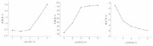 2 .3 交聯[JiaoLian]單體[DanTi]用量[YongLiang]的影響 本實驗采用分階段加入交聯[JiaoLian]單體[DanTi] GMA /MAA 的方法 , 將交聯[JiaoLian]官能團固定在核殼結構不同的層中 , 因為核殼結構乳膠粒堆積成膜過程為 : 隨著水分不斷蒸發 , 粒子緊密接觸 , 水分繼續蒸發 , 導致粒子變形、塌陷 , 各層聚合物由于擴散和粘性流動而相互混合 , 這樣分布在不同層中的環氧基和羧基相遇 , 發生交聯[JiaoLian]反應 , 從而提高[TiGao]漆膜的交聯[JiaoLian]度和致密性 [ 6 ] 。實驗采用核殼質量比為 1 ∶ 1, 在保證兩種官能團比例 1 ∶ 1 的情況下 , 考察交聯[JiaoLian]單體[DanTi]用量[YongLiang]變化 ( 以 MAA 為例 ) 對乳液[RuYe]聚合穩定性[WenDingXing]、漆膜的交聯[JiaoLian]度、耐水性的影響。結果如圖 1 所示。