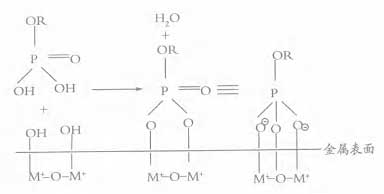 圖 1 MAA 的用量[YongLiang]對乳液[RuYe]及涂膜性能的影響 由實驗結果可見 , 隨著官能團單體[DanTi] ( 以 MAA 為例 ) 用量[YongLiang]的增加 , 乳液[RuYe]凝聚率增加 , 說明聚合穩定性[WenDingXing]和貯存穩定性[WenDingXing]均下降。這是因為官能團單體[DanTi]增多 , 聚合過程、貯存過程中易發生反應的官能團之間接觸的機會就增大 , 交聯[JiaoLian]凝聚傾向增大。成膜時也是如此 , 官能團越多 , 交聯[JiaoLian]密度就越大 , 機械性能提高[TiGao] , 吸水率下降 , 耐水性也提高[TiGao]。當 MAA 用量[YongLiang] ( 相對于殼層單體[DanTi]總量 ) 為 3% 時 , 乳液[RuYe]有較好的綜合性能。因此確定交聯[JiaoLian]單體[DanTi] GMA 和 MAA 的用量[YongLiang]應該為各自所在層單體[DanTi]總量的 3% 。 2 .4 磷酸[LinSuan]酯功能單體[DanTi]對乳液[RuYe]及漆膜性能的影響 為了改善涂層對金屬表面的濕附著力 , 提高[TiGao]乳液[RuYe]的穩定性[WenDingXing] , 選擇了一種磷酸[LinSuan]酯功能單體[DanTi] PAM - 200, 它是磷酸[LinSuan]單酯、磷酸[LinSuan]雙酯 ( 圖 2) 和少量磷酸[LinSuan]單體[DanTi]的混合物 , 磷酸[LinSuan]酯單體[DanTi]的功能性在于 : 磷羥基與金屬表面有較強的螯合作用 , 從而與多價金屬作用形成絡合物 , 以共價鍵的形式把聚合物牢固地連接到金屬基材上 , 增強乳膠漆在各種金屬基材上的附著力。其作用機理如圖 3 所示。 R: 含甲基丙烯酸酯基團 , 使該單體[DanTi]在乳液[RuYe]中易于接到聚合物鏈上。