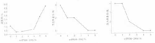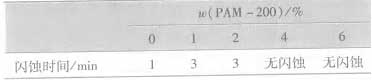 圖 5 PAM - 200 用量[YongLiang]對 Ca 2 + 穩定性[WenDingXing]的影響 2 .5 漆膜耐鹽水性測試 對比了商品苯丙乳液[RuYe]與自制苯丙防銹乳液[RuYe]制成的涂膜在不同的鹽水浸泡時間下其表面形貌的變化 , 實驗結果如表 6 。 表 6 鹽水浸泡不同時間后涂膜的表面形貌