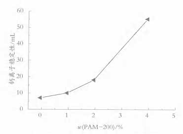 表 5 中的閃蝕時間是指乳液[RuYe]涂刷完畢至鐵板表面出現淡黃色銹跡的時間。隨著 PAM - 200 用量[YongLiang]增加 , 閃蝕時間有所延長 , 當用量[YongLiang]增加至 4% 時 , 完全抑制了閃蝕現象。這是由于磷酸[LinSuan]酯功能單體[DanTi]與金屬基材的共價鍵作用 , 提高[TiGao]了漆膜的濕態附著力 , 從而對閃蝕有一定的阻礙作用。這就證明 , 在 AMP- 95 將 pH 值調節至 8 的條件下 , 加入 4% 的 PAM - 200 可以完全抑制金屬的閃蝕。 功能單體[DanTi] PAM - 200 加入量對 Ca 2 + 穩定性[WenDingXing]的影響如圖 5 所示。 由圖 5 可知在一定 pH 值下 , 隨著 PAM - 200 的用量[YongLiang]從 0 增加至 4% , 其穩定效果增強。在這里 , 磷酸[LinSuan]酯作為一種陰離子型表面活性劑能有效地穩定乳液[RuYe]聚合中的乳膠粒 , 其中的磷酸[LinSuan]成分作為親水端作用 , 可以穩定分散顏填料 , 顯著提高[TiGao]乳液[RuYe]的鈣離子穩定性[WenDingXing]。在乳液[RuYe] pH 值為 8 的條件下 , PAM - 200 用量[YongLiang]為 4% 時 , 穩定效果最佳 , 鈣離子穩定性[WenDingXing]達到 55 mL, 完全符合施工標準。