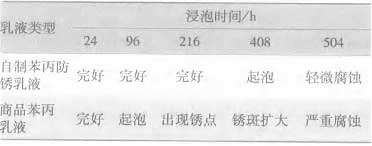1 .3 性能測試 (1) 乳液[RuYe]粒徑 : 用 ZETA SIZER 型粒徑分析儀 ( 英國馬爾文公司 ) 測定。 (2) 凝聚率 : 聚合反應結束 , 將乳液[RuYe]用 100 目過濾網過濾 , 收集濾渣及反應器、攪拌器上的凝聚物 , 于 (3) 黏度 :DV - 1 型旋轉式智能數顯黏度計。 (4) 鈣離子穩定性[WenDingXing] : 取 10 mL 乳液[RuYe] , 用 5% 的 CaCl 2 溶液對乳液[RuYe]進行滴定 , 以乳液[RuYe]中出現絮凝物作為滴定的終點 , 所耗 CaCl 2 溶液的量來表示乳液[RuYe]的鈣離子穩定性[WenDingXing] [ 4 ] 。 表 2 水性防銹典型配方