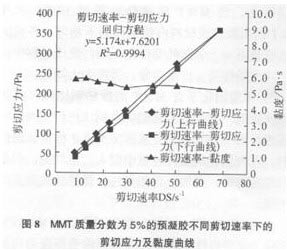 圖7為環(huán)氧樹脂[HuanYangShuZhi]剪切[JianQie]速率[SuLv]-剪切[JianQie]應(yīng)力[YingLi]及黏度曲線(已添加稀釋劑),隨著剪切[JianQie]速率[SuLv]的增大,環(huán)氧樹脂[HuanYangShuZhi]的黏度不發(fā)生變化,剪切[JianQie]速率[SuLv]-剪切[JianQie]應(yīng)力[YingLi]滿足線性相關(guān)[XiangGuan],應(yīng)力[YingLi]回歸方程為y=0.7914χ,相關(guān)[XiangGuan]系數(shù)R2=0.9995環(huán)氧樹脂[HuanYangShuZhi]為典型的牛頓液體,其黏度為O.78Pa.s。 (2)MMT質(zhì)量[ZhiLiang]分?jǐn)?shù)為5%預(yù)凝膠[NingJiao]的流變[LiuBian]特性