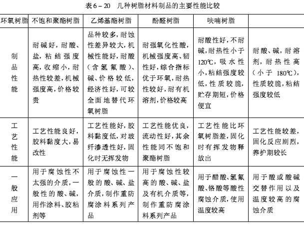 樹脂類防腐蝕材料,綜合性能優(yōu)良,耐腐蝕性突出,適用范圍廣,選擇余地大,它們不但具有密實、抗水、抗?jié)B漏好、強度高等特點,同時具有附著力強、常溫操作、施工簡便等良好的工藝性,而且價格適中。采用這類材料的防腐蝕工程一般包括:樹脂膠料輔襯的玻璃鋼整體面層和隔離層;樹脂膠泥和砂漿鋪砌的塊材面層;樹脂膠泥勾縫與灌縫的塊材面層;樹脂稀膠泥或砂漿制作的單一與復(fù)合的整體面層及隔離層;樹脂玻璃鱗片膠泥面層等等。選用的材料品種不同,防腐蝕工程的最終產(chǎn)品功能以及適用范圍將有很大不同。環(huán)氧樹脂材料制品與其他幾種樹脂材料的主要性能比較,見表6-20。