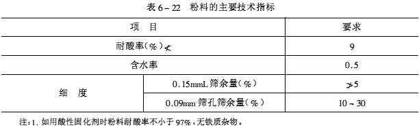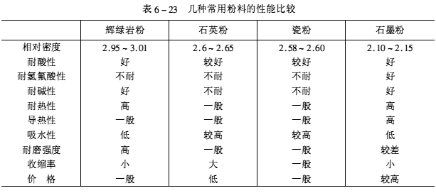 常用的粉料為石英粉、瓷粉,此外還有石墨粉、輝綠巖粉、滑石粉、云母粉等。粉料的技術(shù)性能見表6-22。