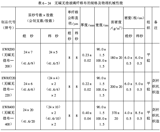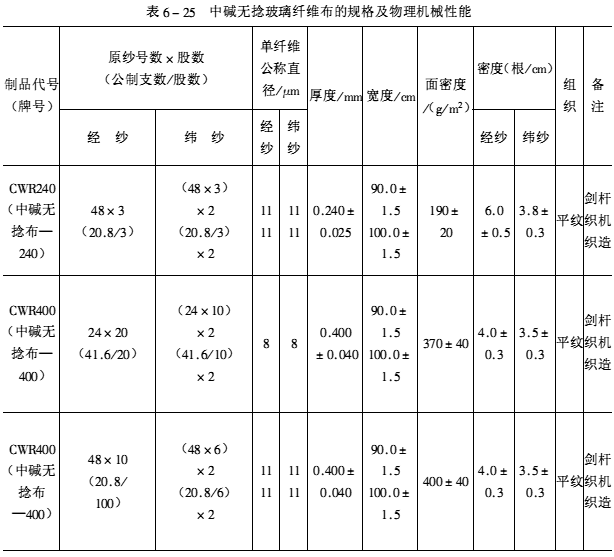 防腐蝕工程中最常用的是玻璃纖維布、玻璃纖維表面氈和玻璃纖維短切氈,用于氫氟酸等含氟工程時,采用無紡滌綸布、氈和丙綸布、氈。玻璃纖維布宜采用無堿(中堿)無捻粗紗玻璃纖維方格布,其厚度宜為0.2~0.4mm,經(jīng)緯密度宜為每平方厘米4×4~8×8紗根數(shù),規(guī)格及物理機械性能見表6-24和表6-25。玻璃纖維氈包括:玻璃纖維短切氈、玻璃纖維表面氈。玻璃纖維短切氈是由長度50~70m的短切纖維不規(guī)則粘結(jié)而成。玻璃纖維表面氈是用粘結(jié)劑將定長纖維隨機地均勻鋪放后粘結(jié)成氈,其厚度約為0.3~0.4mm,主要用于手糊成型制品表面。使制品表面光滑,且樹脂含量較高,耐老化和耐腐蝕性能較好。耐腐蝕增強塑料的富樹脂層一般均用表面氈片,其樹脂含量可高達(dá)85%以上,有E和C玻璃纖維兩種。