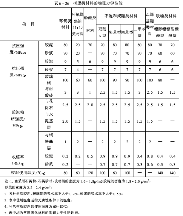 樹脂類材料制成品包括:樹脂膠泥、樹脂砂漿和玻璃鋼,其相應(yīng)的技術(shù)性能指標(biāo)主要包括:膠泥與各種不同類型材料的粘結(jié)強度、膠泥及砂漿的收縮率和抗壓強度、樹脂類材料的抗拉性能指標(biāo)和使用溫度范圍等,表6-26列出了常用的樹脂類材料的物理力學(xué)性能指標(biāo)。