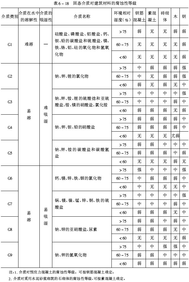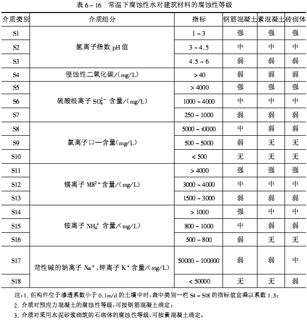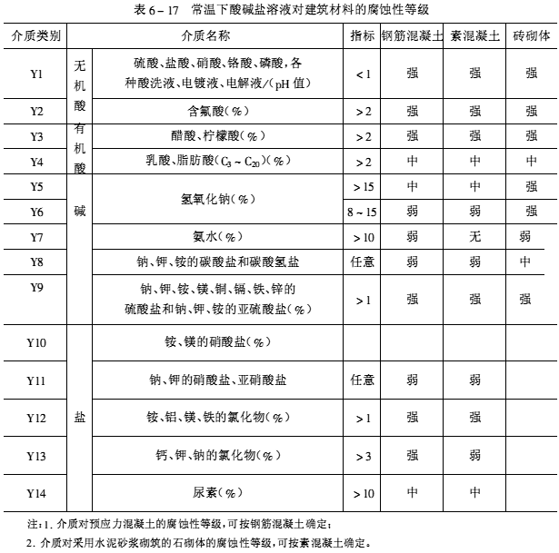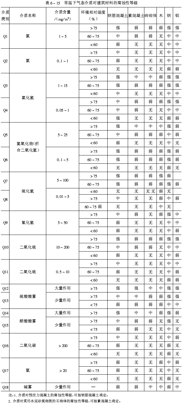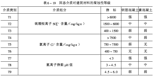 根據腐蝕性介質的形態及其對建筑結構的腐蝕特征可分為五大類:即氣態介質、腐蝕性水、酸堿鹽溶液、固態介質和污染土。各種介質可按其性質、含量劃分類別,根據各種介質對建筑材料長期作用下的腐蝕性,又可分為強腐蝕、中等腐蝕、弱腐蝕、無腐蝕四個等級,見表6-15~表6-19。設計、施工單位可按工程的腐蝕特征,選擇適當的耐腐蝕材料和采取有效的防護措施。