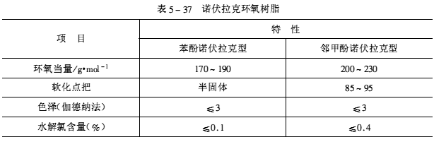 諾伏拉克環氧樹脂,由于結構含有多環氧基,基體的耐熱性等性能會有明顯提高。但是,產品脆性較大,粘合性較差。在環氧樹脂覆銅板生產中一般不單獨使用,而是與雙酚A型環氧樹脂配合使用。諾伏拉克環氧樹脂的使用量一般為環氧樹脂總量的20%~30%。諾伏拉克環氧樹脂的特性,如表5-37所示。