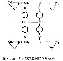 (1)阻擋UV 隨著電子工業的迅速發展,印制電路高精度、高密度化,在雙而印制板和多層印制板的制造過程中,廣泛采用液體光敏阻焊劑和兩面同時暴光的新工藝。由于紫外光(UV)可以穿透基板,兩面的線路圖形相互干擾,出現重影(GHOST IMAGE),造成廢品。為了避免出現重影,基體用的環氧樹脂必須具有阻擋紫外光(UV blocking)的功能。目前,行業中一般的做法是,在環氧樹脂體系中添加四官能基環氧樹脂或UV吸收劑,利用其本身具備熒光發色團性質,吸收UV光,達到阻擋的效果。四百能環氧樹脂的化學結構,如圖5-20所示。