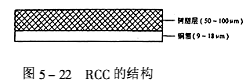 (1)RCC的結構 RCC是由表面經粗化、耐熱、防氧化等處理的高溫延伸性銅箔和B階樹脂組成的。其結構如圖5-22。
