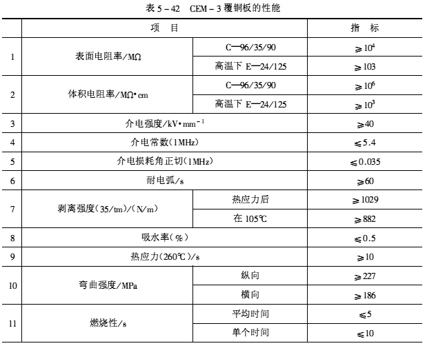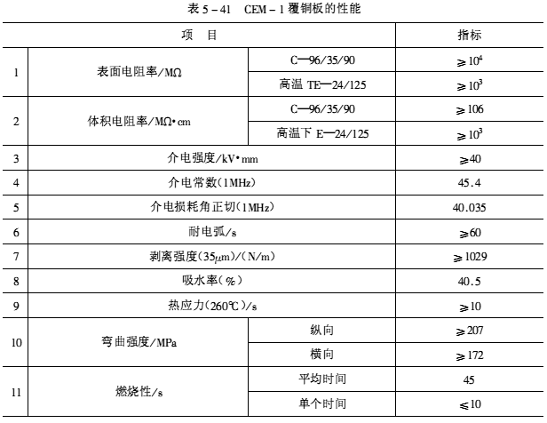 ![]() (3)產品性能 CEM-1覆銅板的性能如表5-41所示。