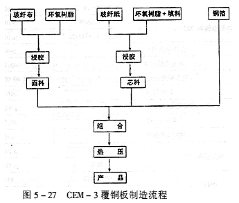 ![]() (1)產品結構與特點 CEM-3覆銅板的結構,如圖5-26所示。