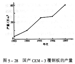 ![]() (3)產品性能。CEM-3覆銅板的性能,如表5-42所示。隨著CEM-3覆銅板品質的不斷改進和提高,市場需求越來越大。近年來,除日本外,韓國和我國臺灣在CEM-3的生產和應用方面發展也很快。1992年,國內成功開發了CEM-3覆銅板,幾年來,產量逐年增加,如圖5-28所示。