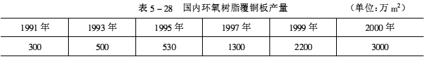 ![]() 目前,在環(huán)氧樹脂覆銅板生產(chǎn)總量中,F(xiàn)R-4覆銅板占80%以上。根據(jù)日本印制電路工業(yè)會(JPCA)調(diào)查預(yù)測,今后若干年,在環(huán)氧樹脂覆銅板需求方面,F(xiàn)R-4覆銅板仍然會居首位。1986年,廣東生益科技股份有限公司率先從美國引進了FR-4覆銅板生產(chǎn)線。十幾年來,國內(nèi)的環(huán)氧樹脂覆銅板工業(yè)發(fā)展很快,產(chǎn)量逐年上升,如表5-28所示。