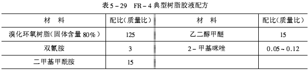 (1)樹脂膠液配方 在環(huán)氧樹脂覆銅板行業(yè)中,78-.覆銅板已生產(chǎn)多年,樹脂膠液配方基本上大同小異。典型的樹脂膠液配方如表5-29所示。