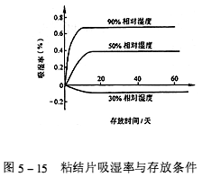 (4)粘結(jié)片的貯存經(jīng)外觀和各項技術(shù)指標檢測后,粘結(jié)片應(yīng)整齊疊放,按要求進行存放管理。粘結(jié)片中的環(huán)氧樹脂處于半固化狀態(tài),在存放過程中,粘結(jié)片的品質(zhì)將隨存放條件和存放時間的變化而變化。粘結(jié)片在各種相對濕度條件下吸濕率的變化情況,如圖5-15所示。
