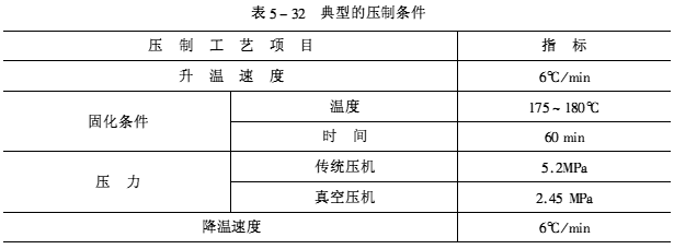 環(huán)氧樹脂覆銅板的壓制過程大體分成升溫、保溫和降溫三個階段。壓制過程可手工操作,也可由電腦控制。升溫階段,主要是使熱量從加熱板逐步傳遞到層間每塊產(chǎn)品,使樹脂熔化、流動。同時,根據(jù)樹脂的熔化和流動情況,進行加壓。實踐證明,這個階段是壓制過程的關(guān)鍵。如果加壓不及時,將造成“欠壓”而出現(xiàn)“微氣泡”和“干花”等缺陷。相反,如果加壓過早,將導(dǎo)致流膠過多或滑板等問題。典型的壓制條件,如表5-32所示。