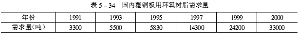 在環(huán)氧樹脂覆銅板行業(yè)中,大量采用溴化環(huán)氧樹脂。因為,溴化環(huán)氧樹脂保持了環(huán)氧樹脂的各種優(yōu)點,而且克服了一般環(huán)氧樹脂易燃的缺點,所以得到廣泛的應(yīng)用。國內(nèi),隨著覆銅板工業(yè)的發(fā)展,對溴化環(huán)氧樹脂的需求量,逐年在增加,如表5-34所示。
