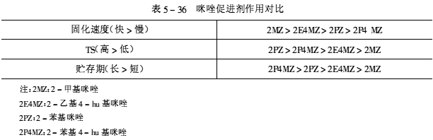 在FR-4樹脂體系中,無論是采用雙氰胺或采用諾伏拉克樹脂作固化劑,其固化速度都比較慢。為了加快其固化速度,在樹脂體系中需要加入適量的咪唑類固化促進劑。在選用固化促進劑時,應(yīng)從固化速度、樹脂體系穩(wěn)定性,以及對覆銅板性能的影響等方面綜合考慮,選優(yōu)錄用。幾種常用的咪唑促進劑的作用對比如表5-36所示。