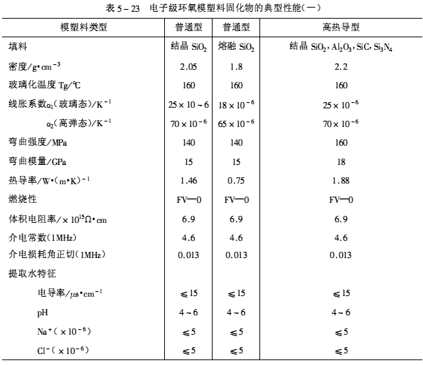 為了滿足大功率分立器件、高熱量器件、特別是全包封分立器件對(duì)熱導(dǎo)的較高的要求,研制出了高熱導(dǎo)型環(huán)氧模塑料。主要采用結(jié)晶型二氧化硅、氧化鋁、碳化硅、氮化硅等高熱導(dǎo)填料,應(yīng)用高填充技術(shù)而制備的。其典型產(chǎn)品如:中科院化學(xué)所的KH407—5系列、日本住友的EME—5900HA、日東的MP—4000系列等。典型性能見表5-23。
