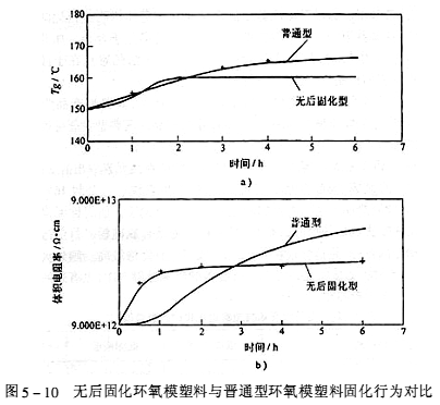 為了提高勞動(dòng)生產(chǎn)率,提高競爭力,要求不進(jìn)行后固化,仍保證材料的耐濕性和耐熱沖擊性。為了適應(yīng)這種要求,通過采用特殊的固化促進(jìn)劑,研制生產(chǎn)出無后固化型環(huán)氧模塑料。其性能特點(diǎn)見圖5-10。