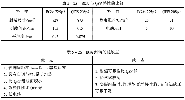 表5-25、表5-26列出了BGA與QFP的比較和它自身的優(yōu)缺點(diǎn)。