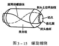 ![]() (3)螺旋纏繞 螺旋纏繞的特點是:芯模繞自身軸線均勻轉動,繞絲嘴沿芯模軸線方向按纏繞角所需要的速度往復運動。螺旋纏繞的基本線型是由封頭上的空間曲線和圓筒段的螺旋線所組成(見圖3-15)。螺旋纏繞纖維在封頭上提供經緯兩個方向的強度,在筒身段提供環向和縱向兩個方向的強度。