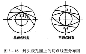 (b)切點數和分布規律。螺旋纏繞的紗片,在完成一個完整循環時,在芯模極孔圓周上只有一個切點,稱單切點。而在一個完整循環中有兩個以上切點的,稱多切點。由于芯模勻速旋轉,繞絲嘴每次往返時間相同,故在極孔圓周上的各切點,將等分極孔圓周。單切點與雙切點的排布如圖3-16所示。