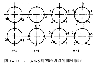 ![]() 當切點數,n≥3時,在與起始切點位置緊挨的切點出現以前,在極孔圓周上已出現,n≥3個切點。多切點線型在完成一個標準線型纏繞期間,相繼出現的任意兩個切點,可以依次排列,也可以間隔排列。當n=3、n=4、n=5時,其切點排列順序如圖3-17所示。
