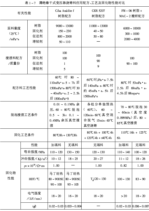 ![]() 國內外幾種薄絕緣干式變壓器環氧澆鑄料性能對比見表1-7。