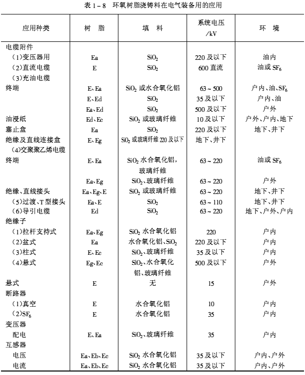 環氧樹脂絕緣澆鑄料在其他電氣裝備中也有著十分廣泛的應用領域。詳見表1-8。