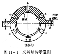 ![]() 安裝夾具前用鋼絲刷清除2個(gè)法蘭盤表面上的鐵銹及雜物,盡量減小與法蘭盤間的配合間隙。將6個(gè)注膠接頭(回止閥)擰緊到夾具上,開啟閥門。為保證安全,操作人員必須穿戴好防護(hù)用品,并接通2條消防水帶,用于安裝夾具時(shí)沖水降溫。